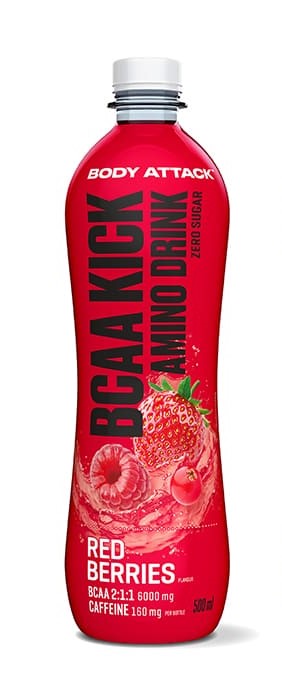 Voda, L-Leucín (0,6%), Kyslík, L-Izoleucín (0,3%), L-Valín (0,3%), Regulátor kyslosti (Kyselina citrónová), Prírodné arómy, Ovocné koncentráty, Kofeín (0,03%), Sladidlo (Sucralóza), Niacín, Vitamín B6.